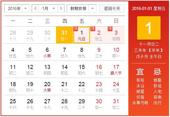 2016年1月1日(星期五)為國(guó)家法定節(jié)假日。